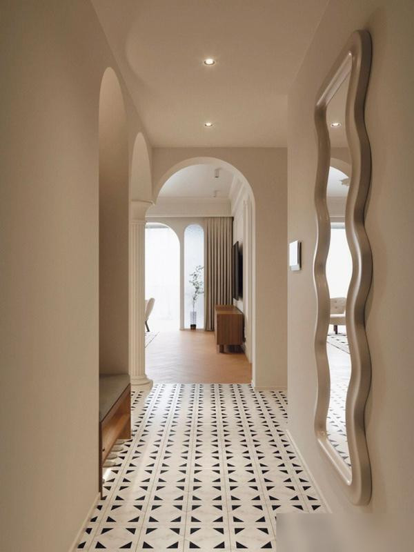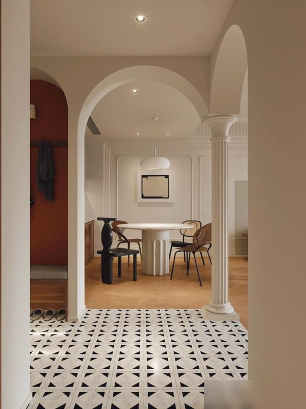 轻法式就聪明在这儿,吊顶直接简化成石膏走线,阳台开个拱门洞,瓷砖换成小花砖,软装阶段自由度拉满。