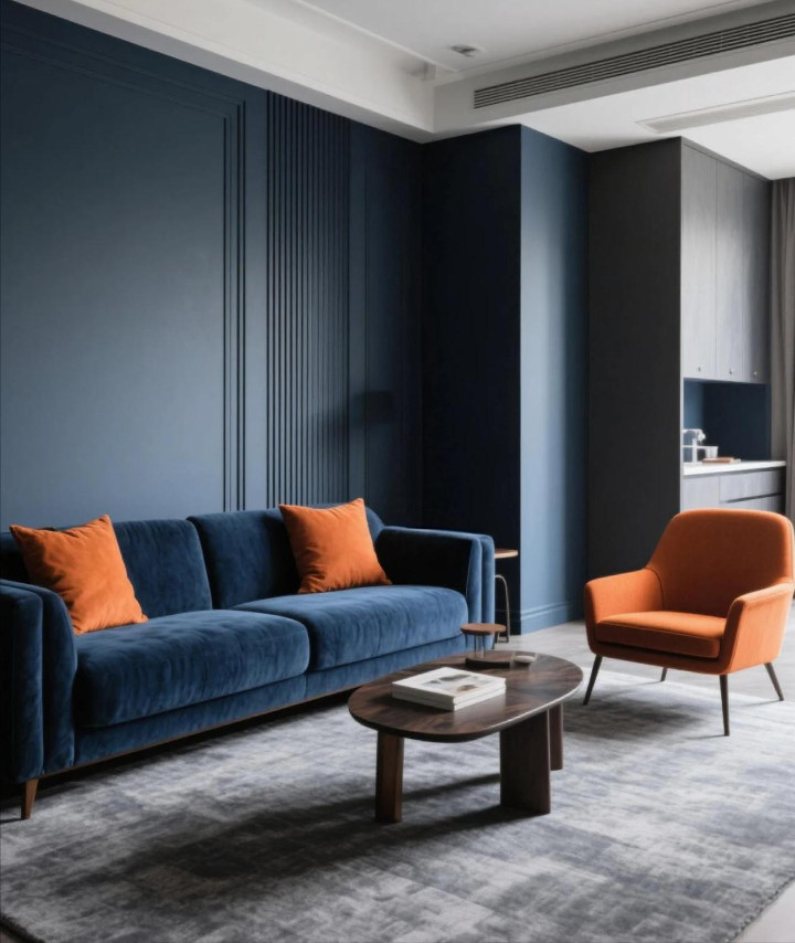对比的意思就是加强,其中主色占70%,对比色占20%,中性色10%,这里的中性色实际上是起到过渡、调和的作用,比如深蓝沙发+橙黄单椅+黑白灰软装。