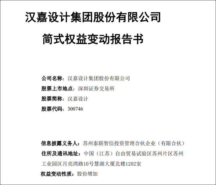 此次权益变动完成后,泰联智信将持有汉嘉设计7.50%的股份,成为公司持股5%以上的重要股东。城建集团及其一致行动人合计持股比例将由52.28%降至44.78%,上市公司控股股东仍为城建集团,实际控制人仍为岑政平、欧薇舟夫妇,控制权未发生变更。、